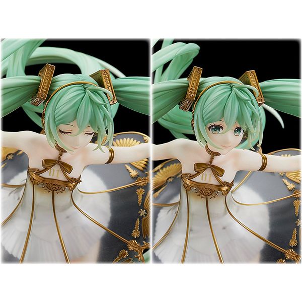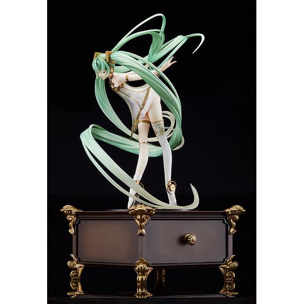 『キャラクター・ボーカル・シリーズ01 初音ミク』より「初音ミク」が、フルオーケストラコンサート「初音ミクシンフォニー2020〜5th Anniversary〜」のメインビジュアルの姿でスケールフィギュア化!イラストレーターRella氏の描く幻想的で美しいビジュアルイメージを、ビジュアルの印象そのままに立体化いたしました。蓄音機をイメージしたドレスはクリアパーツと、パール、ゴールドの塗装で繊細に仕上げました。「目閉じ顔」に加えて、優しく微笑む「笑顔」も付属する豪華仕様。繊細な髪の流れ、手足の様子など魅力が詰まった造形に是非ご注目ください。台座部分は引き出し式で小物入れにもなるため付属のオルゴールが収納可能です。初音ミクシンフォニーの特別なスケールフィギュアをお手元でもお楽しみください。