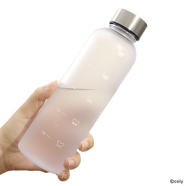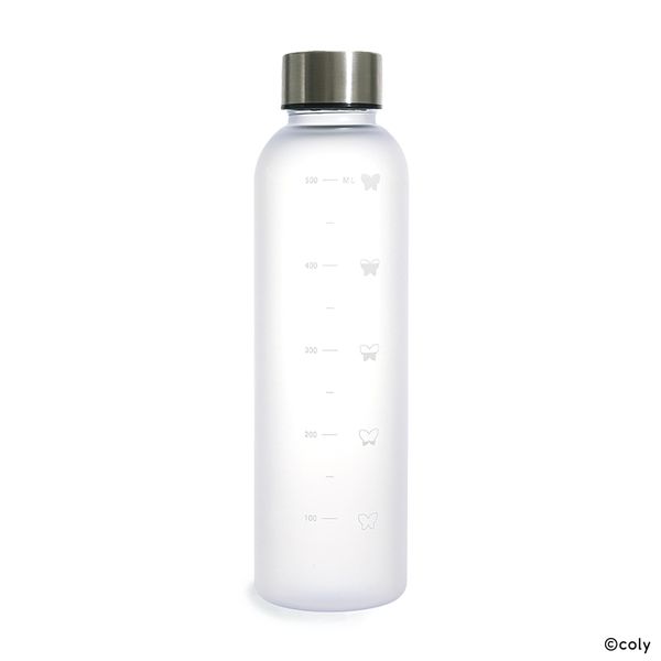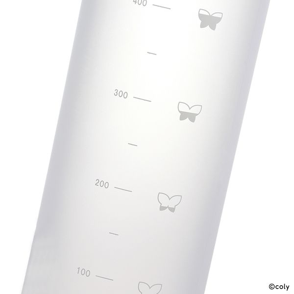 「ロゴ」や所属名をあしらったシンプルなデザインで、飲み物が減っていく様子を表した、目盛り横の蝶のアイコンがポイントです。
