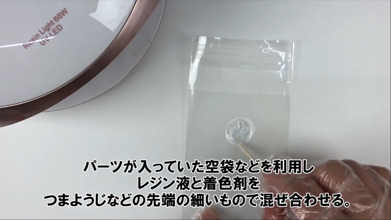 2パーツが入っていた空袋などを利用し、レジン液と着色剤をつまようじなどの先端の細いもので混ぜ合わせます。