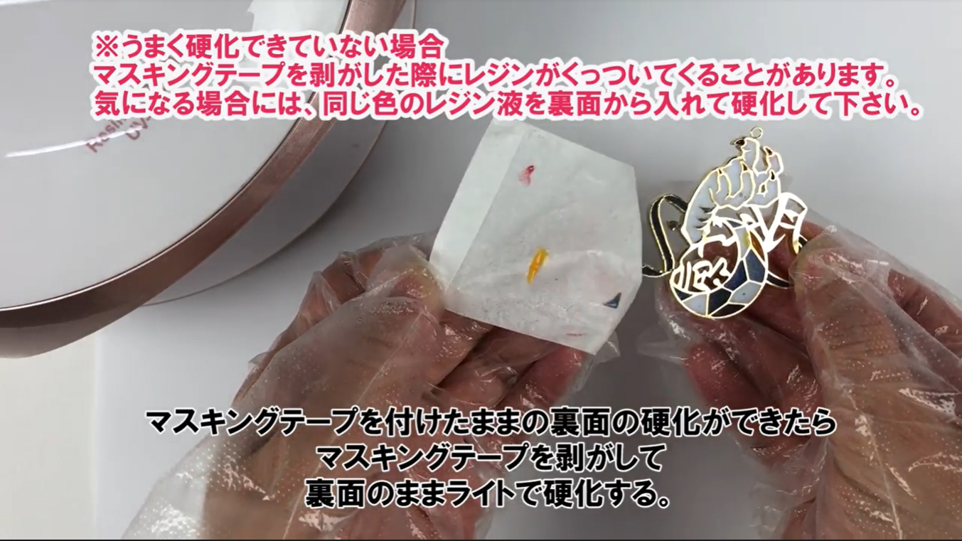 着色剤がレジン液に対して多すぎたり、照射時間が足りず、うまく硬化できていない場合、マスキングテープを剥がした際にくっついてくることがあります。気になる場合には、同じ色のレジン液を裏面から入れて硬化して下さい。